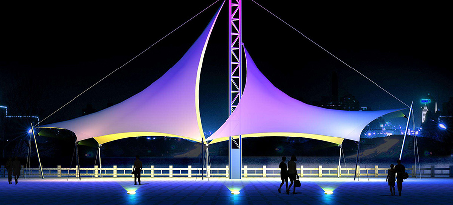 對太陽熱能可反射掉70%,膜材本身吸收了17%,傳熱13%,而透光率卻在20%以上,經過10年的太陽光直接照射,其輝度仍能保留70%。公司致力于客戶享受到本公司的設計獨特、結構新穎、造型優雅的膜結構精品工程。